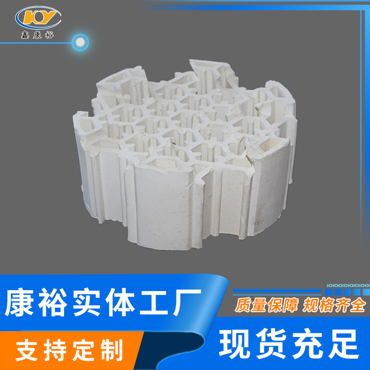 輕瓷填料產(chǎn)品的堆積重量為280~350kg/m3,遠小于一般普通規整填料的堆積密度。產(chǎn)品的堆積空隙率≥72%,顯氣孔率≥15%,總空隙率高達85%以上。從面具有填料塔重量輕、載荷小、操作阻力小、壓降低的優(yōu)點(diǎn)。