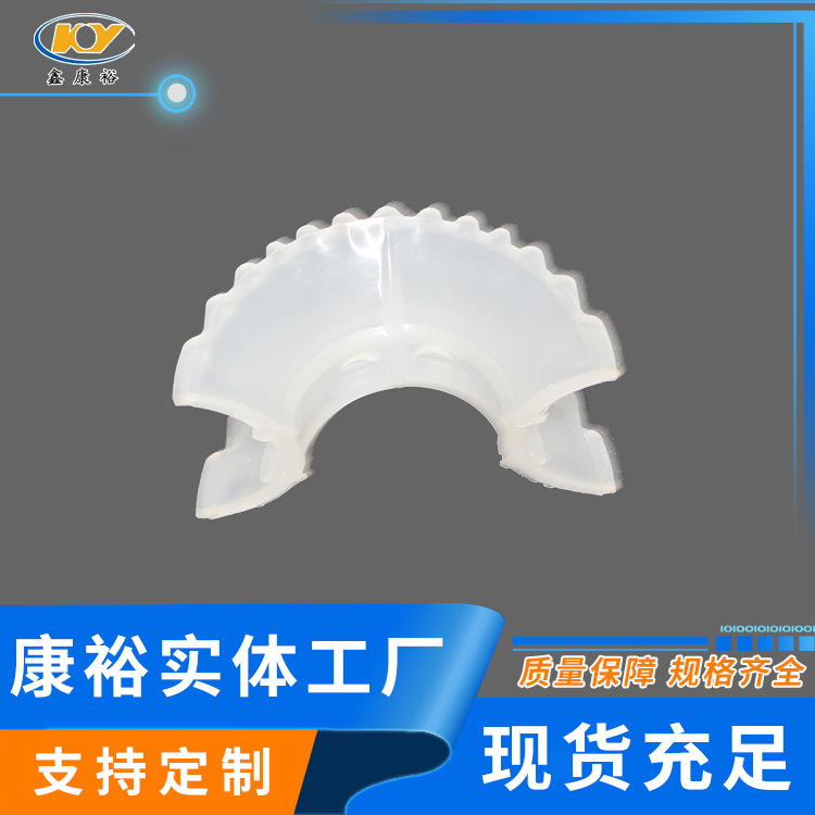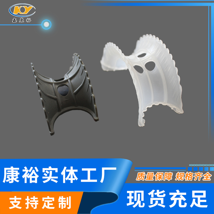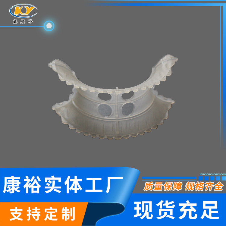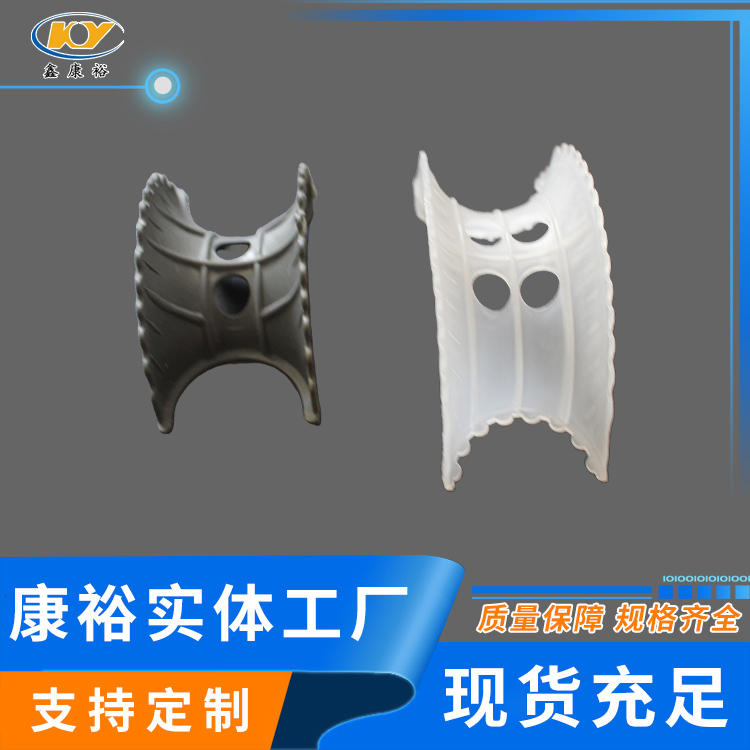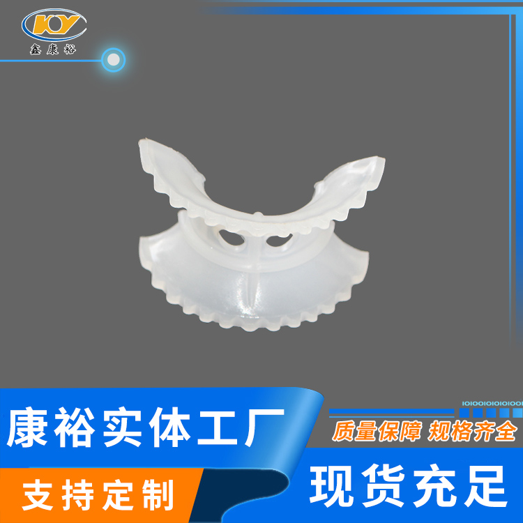 塑料異鞍環(huán)是20世紀70年代美國Noton公司對普通矩鞍環(huán)填料作出了改進(jìn),其特點(diǎn)是將扇形弧面改進(jìn)成帶鋸齒邊緣的貝殼狀弧面,并在鞍背上增加了開(kāi)孔,這樣填料層內的通道更加通暢,改善了液體分布性能,降低了氣體通過(guò)的阻力,提高了傳質(zhì)性能。塑料異鞍環(huán)鞍形填料類(lèi)似于馬鞍形狀,這種填料層中主要為弧形的液體通道,填料層內的空隙較環(huán)形填料(尤其較拉西環(huán)填料)更加連續。